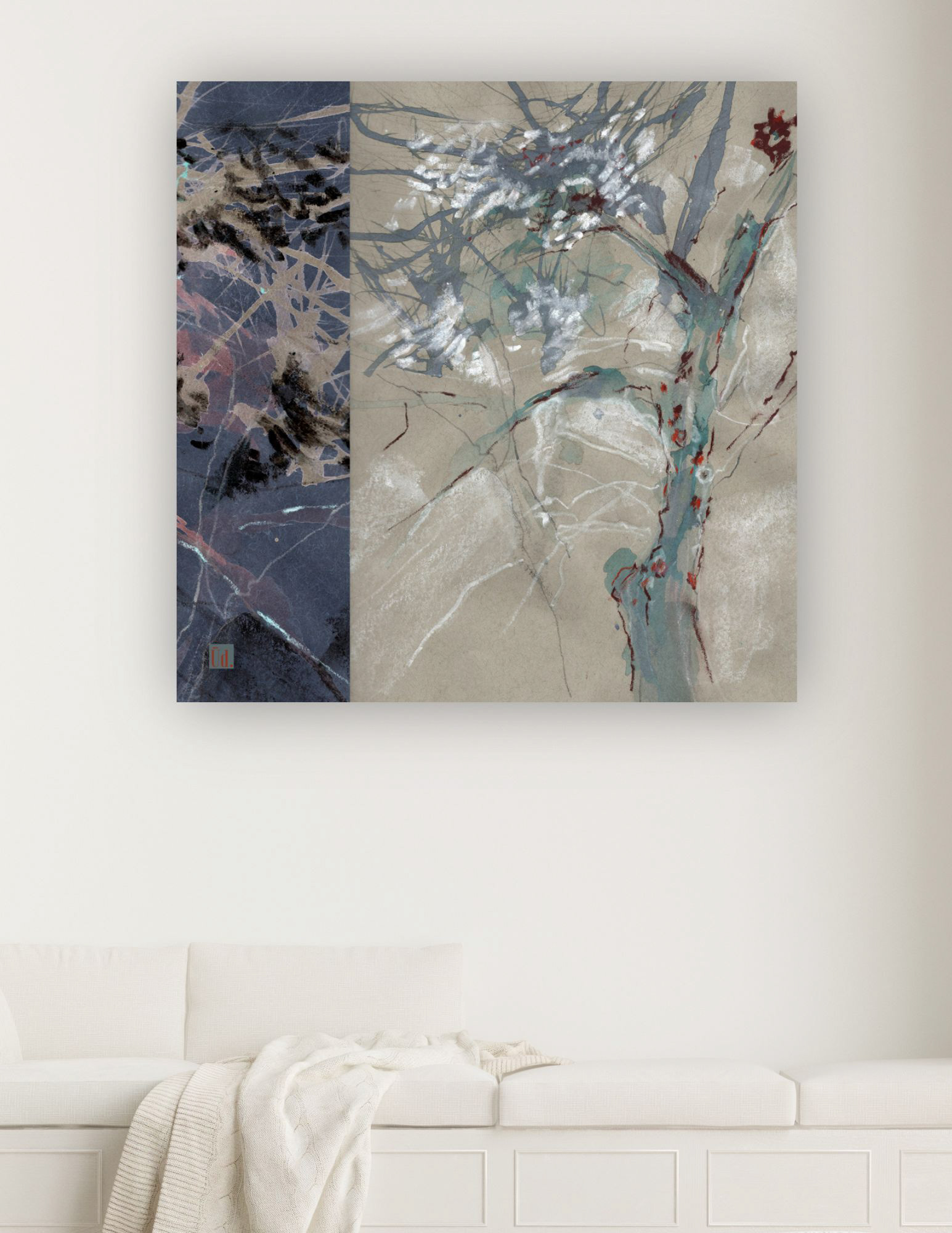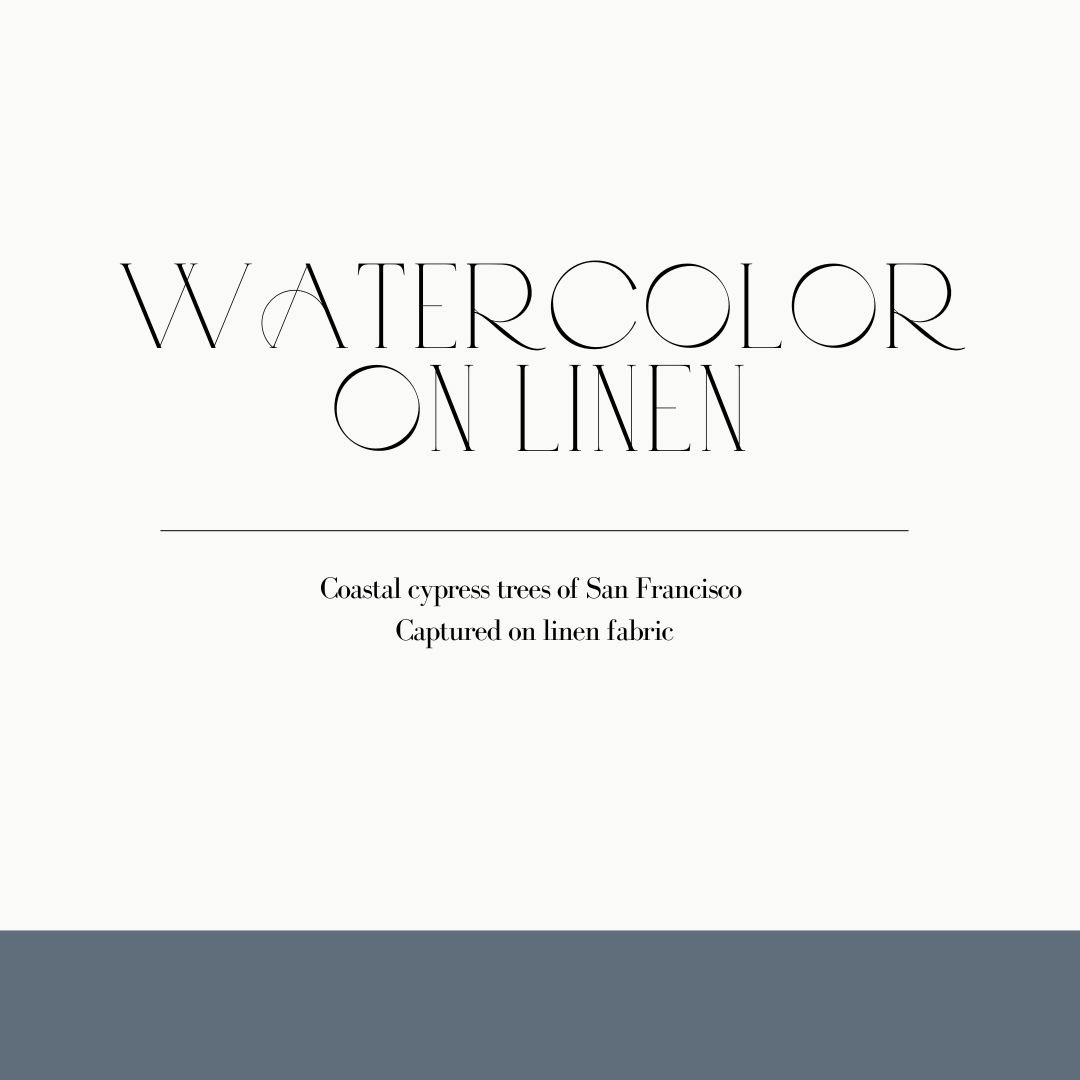 Textile wall art (Folded view): Dramatic lone cypress tree against a dusky blue sky. Deep blue hues with hints of yellow and dusty pink accents.