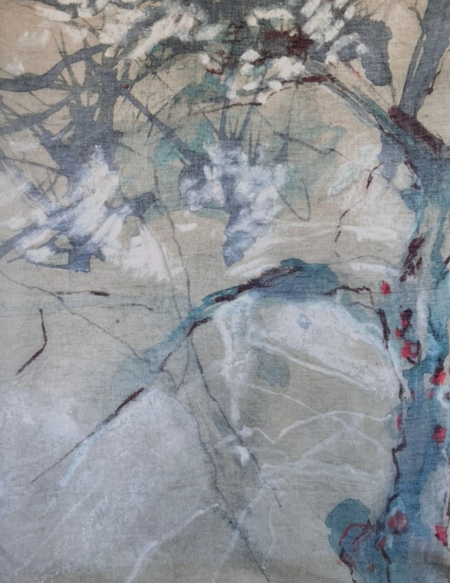 Close-up view  of hanging textile wall art: vibrant cypress tree illustration with sunlight filtering through branches. Colors range from silvery teals to deep indigo, with warm sienna red accents.