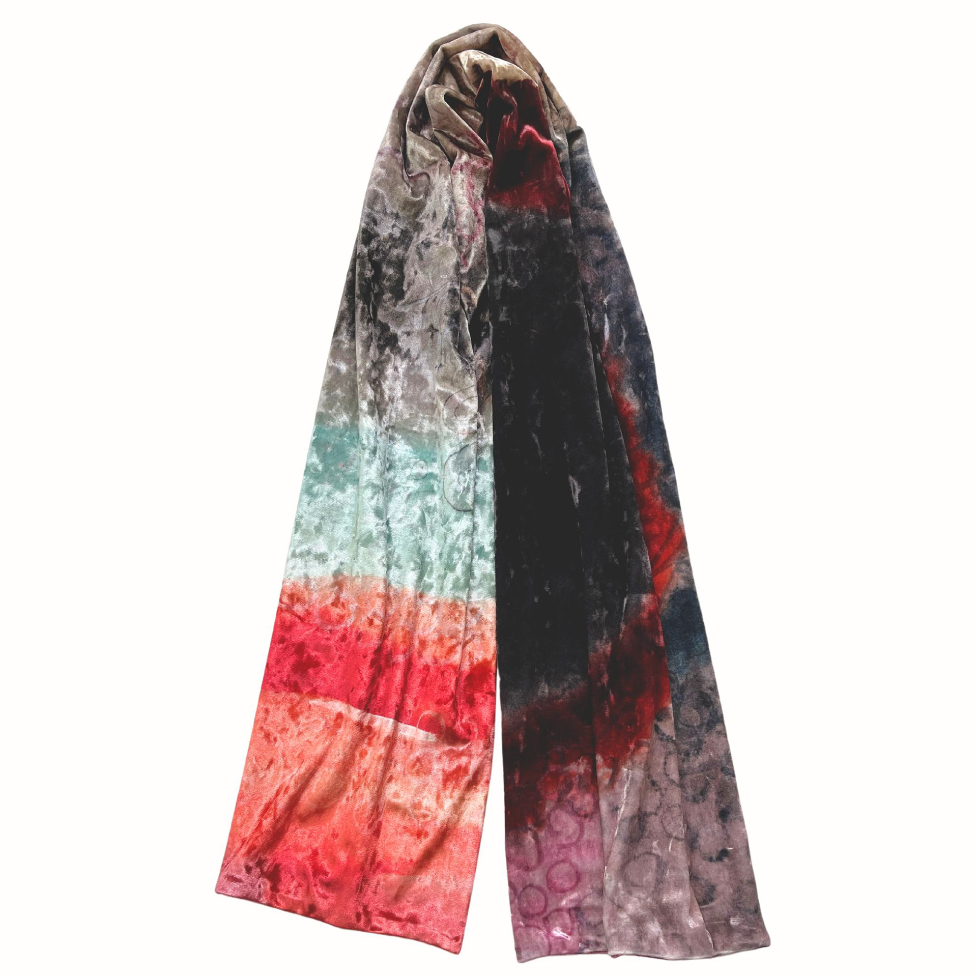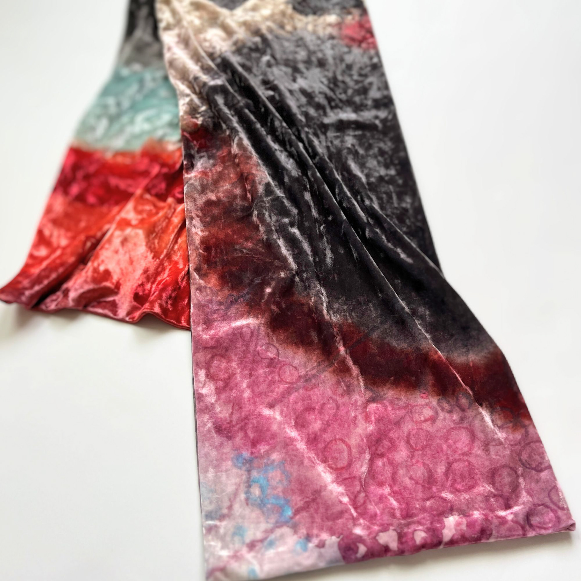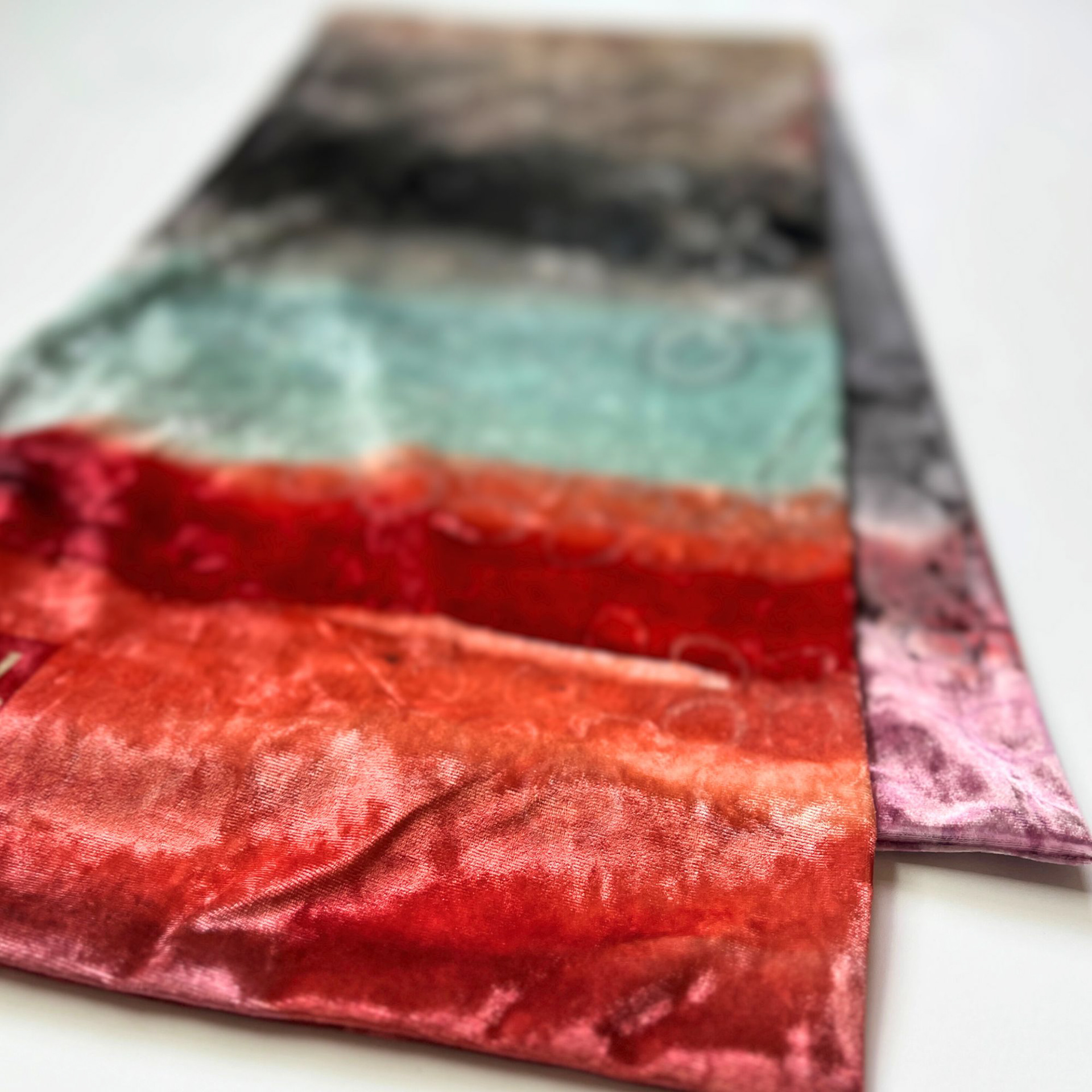 a photo collage Top middle image: A velour scarf with a crow perched on top of multi-colored dots ranging from pink to red and orange. * Top right image and middle right image: Close-up shots of geometric scarves in deep wine red colors. * Middle row, left and right images: Close-ups of a scarf design featuring wet-on-wet watercolor dots in deep shades, with orange and pink accents. * Bottom row: Geometric scarves in blue, aqua green, and silvery tones, all of the same style.