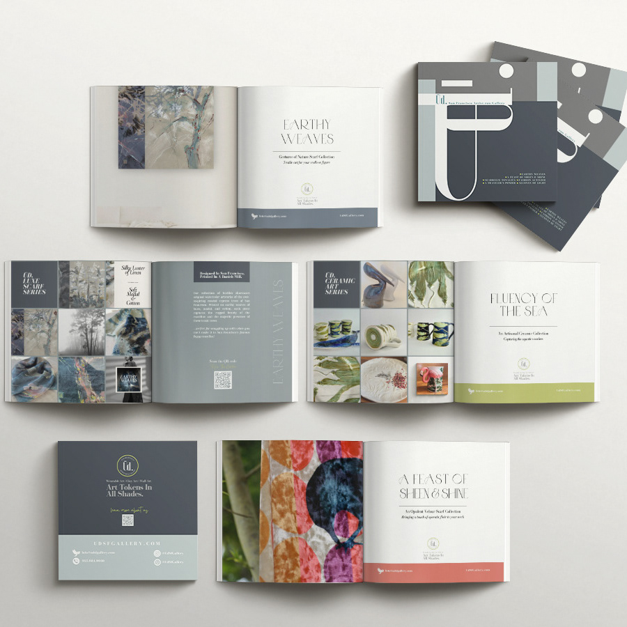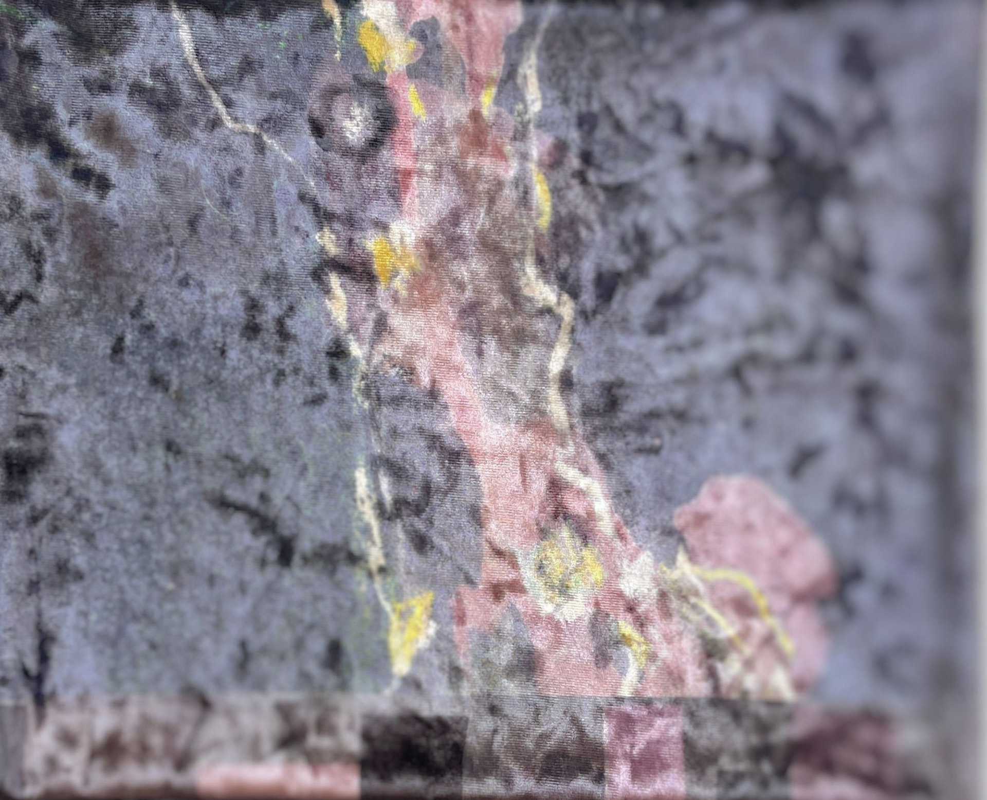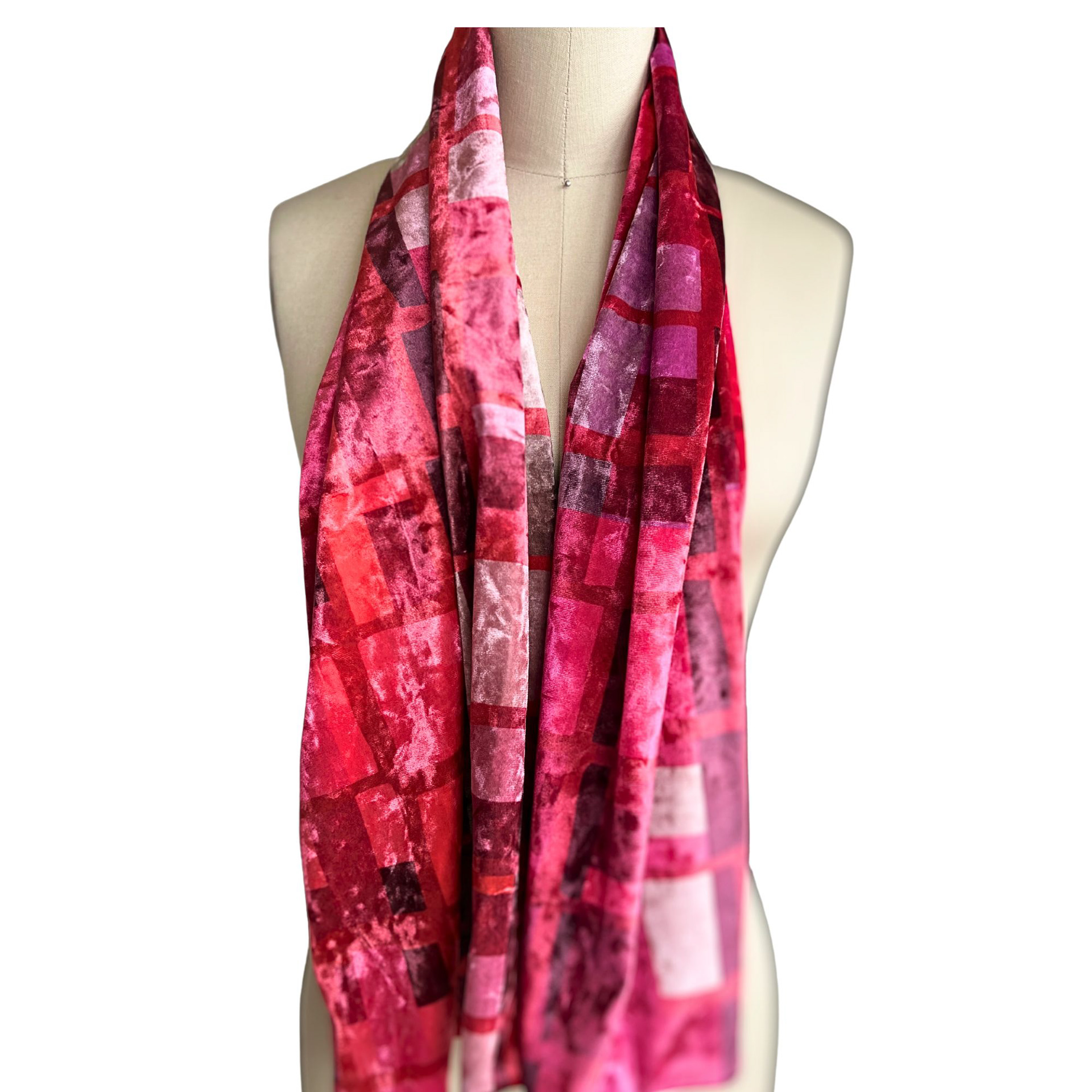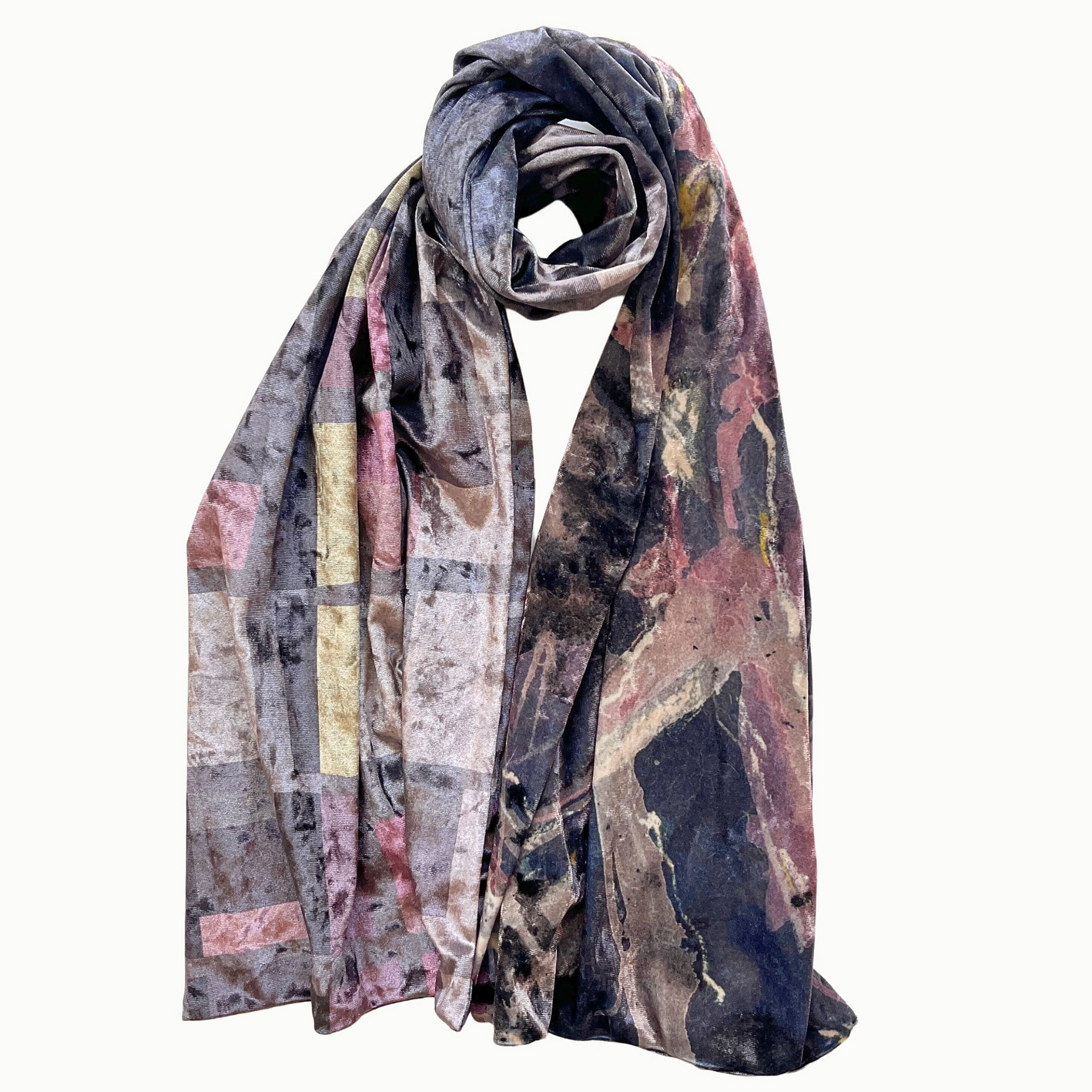 a photo collage Top middle image: A velour scarf with a crow perched on top of multi-colored dots ranging from pink to red and orange. * Top right image and middle right image: Close-up shots of geometric scarves in deep wine red colors. * Middle row, left and right images: Close-ups of a scarf design featuring wet-on-wet watercolor dots in deep shades, with orange and pink accents. * Bottom row: Geometric scarves in blue, aqua green, and silvery tones, all of the same style.