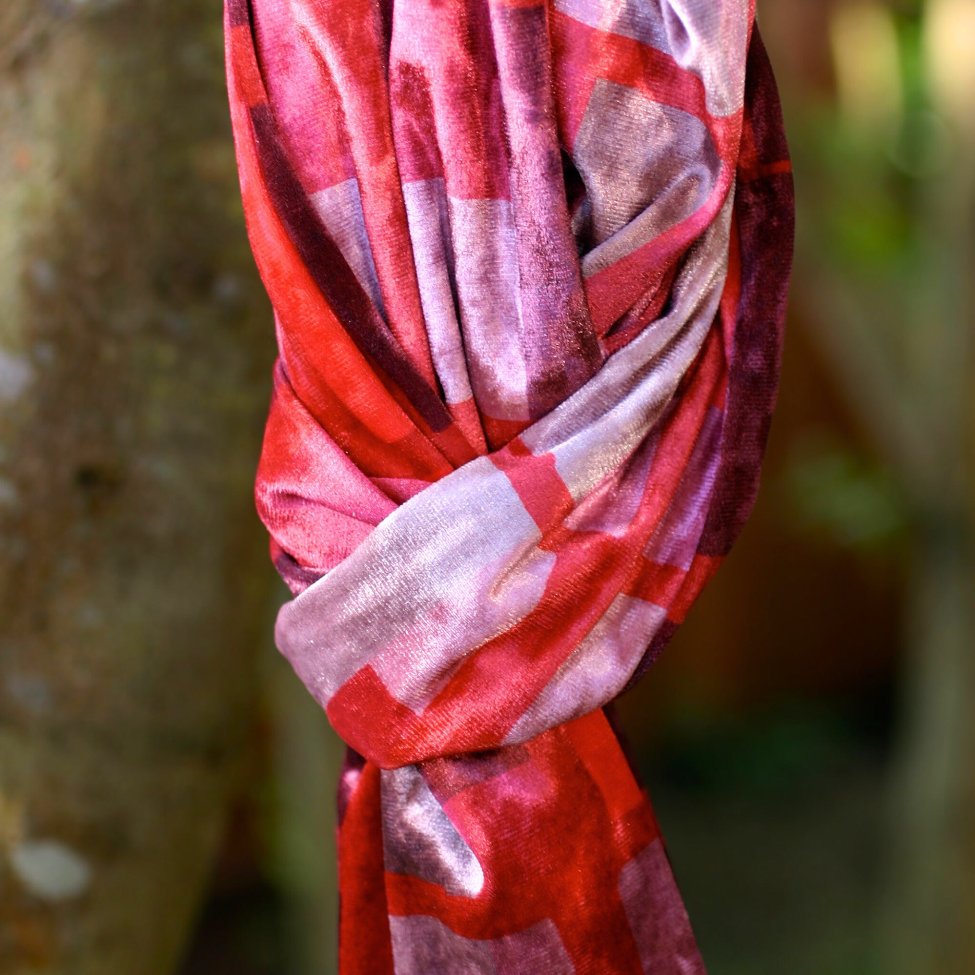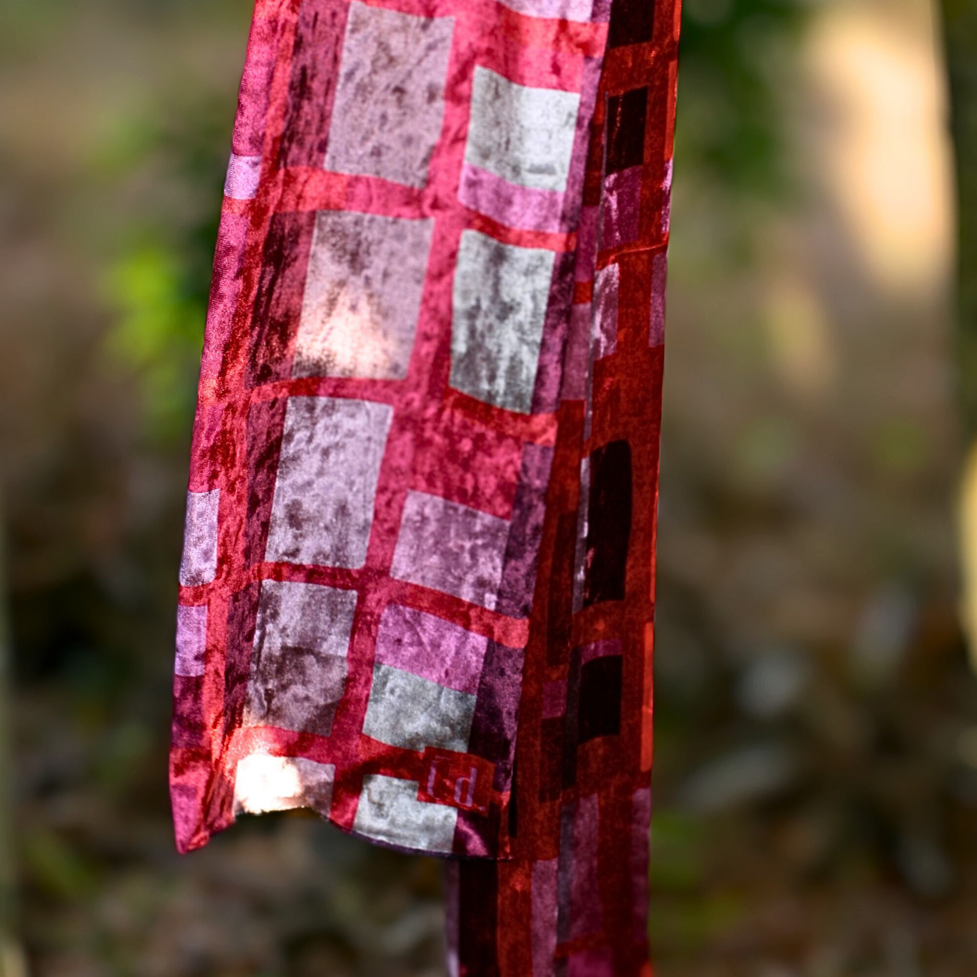 A deep wine red geometric scarf hanging from a sunlit tree.