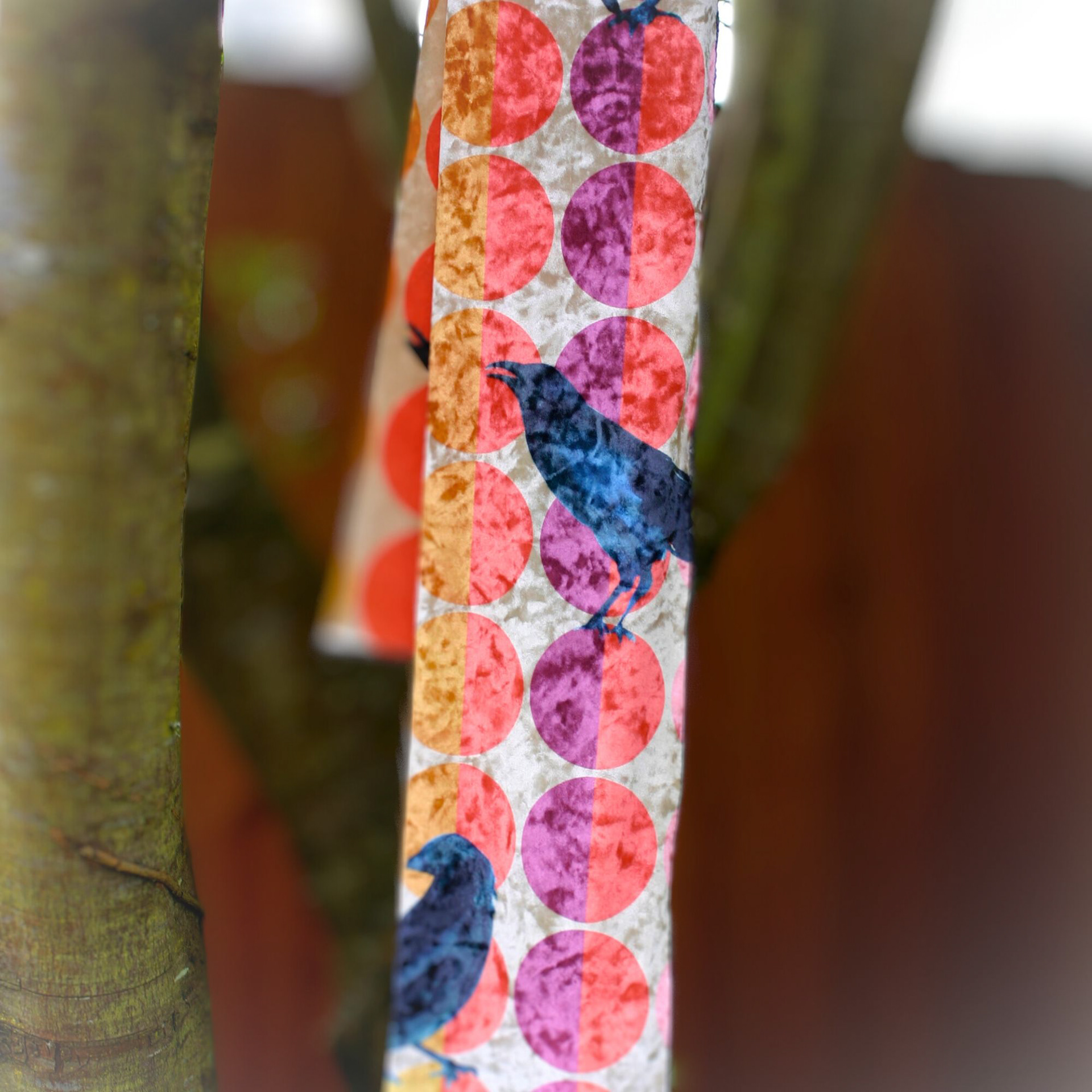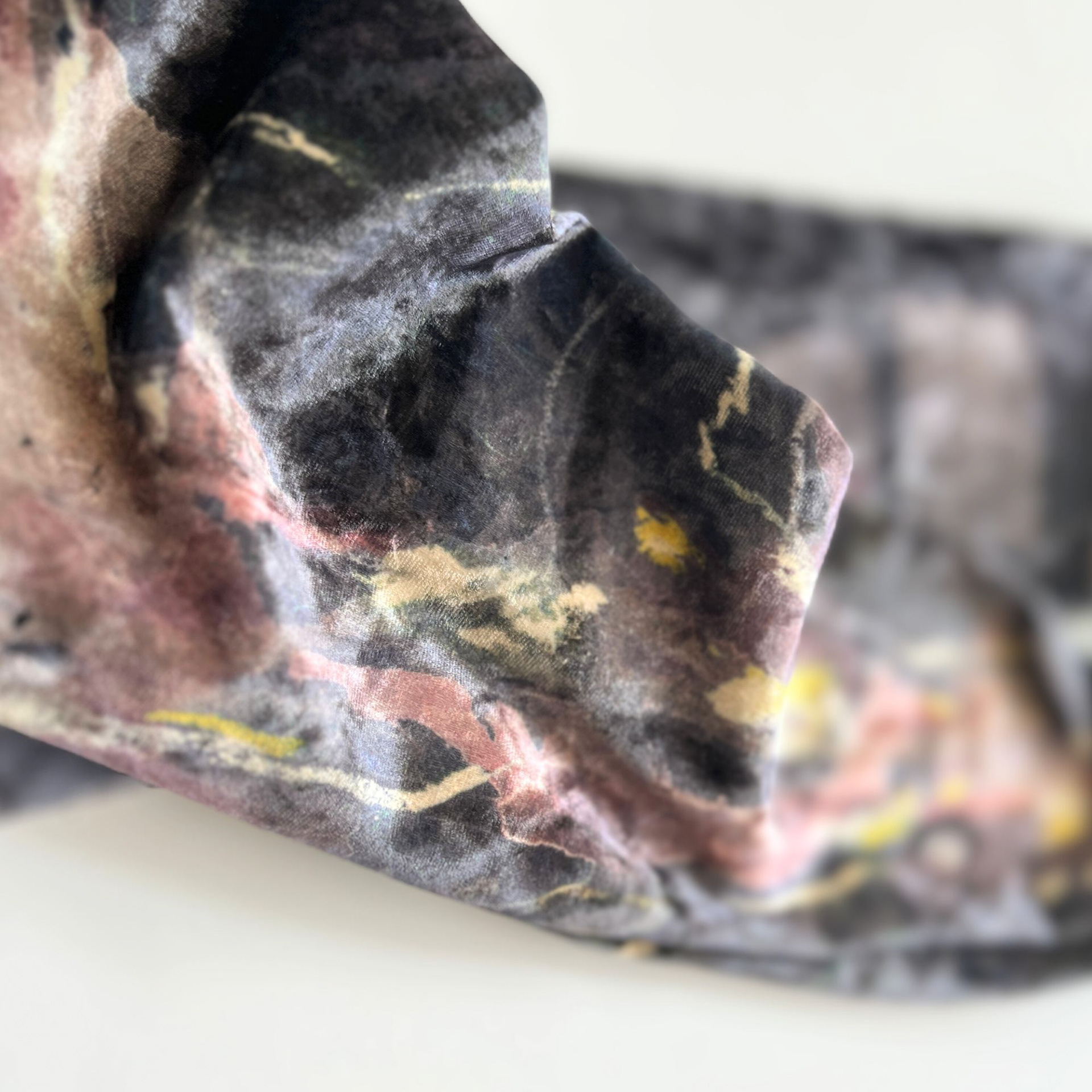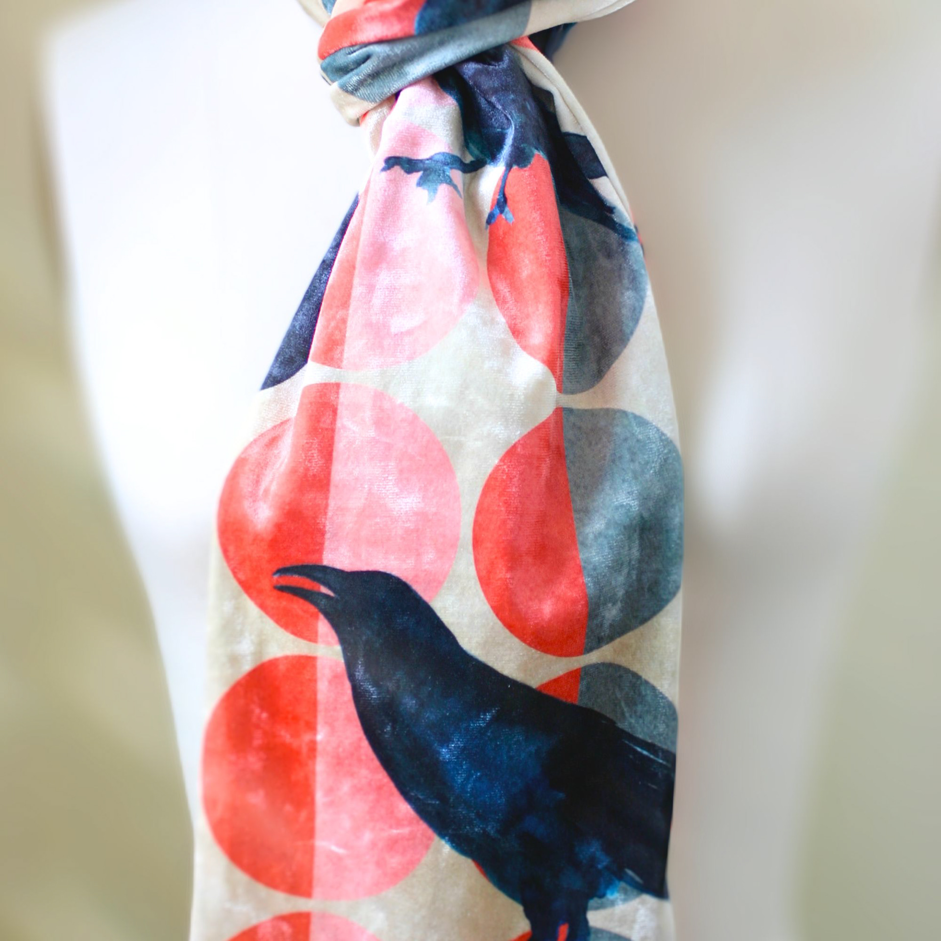 Close-up view of the velour scarf featuring an illustration of a raven in shades of black moonstone and blue onyx. The ravens are perched on top of multi-colored dots.